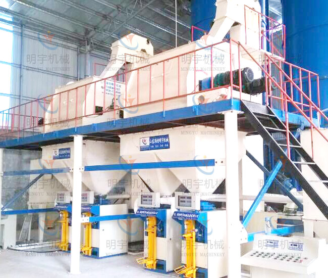 该设备主要由加料斗、斗式提升机、卧式无重力搅拌机、成品仓、自动称量包装机、电控箱、平台、支架、除尘器组成。 工人根据配比将原料依次投入加料斗内,由斗式提升机将物料提升至卧式无重力搅拌机,混合2-3分钟(根据不同物料混合时间略有差别)。混合好的物料依靠自身重力落至成品仓,成品仓下部配全自动称量包装机,将混合好的成品装袋包装。在包装过程中,可以重复上面投料、提升、搅拌等过程,以实现流水线作业,提供生产效率。